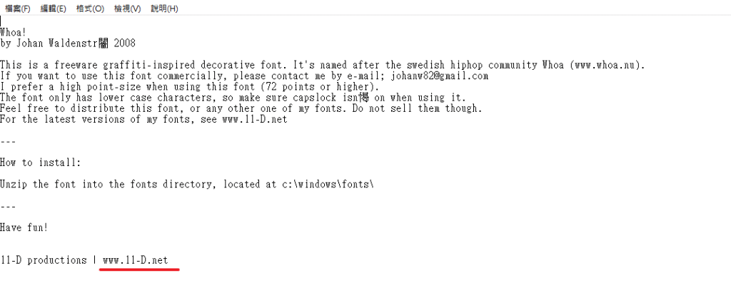 菜鳥救星分享:免費字體下載-Whoa 發佈日期: 2021-01-142022-11-25 作者: yijun 文、菜鳥編 今天要介紹一款很有嘻哈風的字體,名稱也相當好記,就是「哇」!字體粗體的表現相當吸睛,在強調的效果上相當好用,一款值得收藏的字體。 字體名稱:Whoa下載位置:http://bit.ly/2URW70W 進到網頁可以看到字體的表現,其中字母「I」的表現還使用了手指頭,相當俏皮。 大家關心的是否可商業使用,在網站上也有聲明。 在授權聲明的上方 就可以看到下載點,下載量也是相當驚人。 網站提供測試功能,可先將你要使用的內容輸入查看效果,滿意在下載。 下載下來的為壓縮檔,壓解縮後可以看到3個檔案。 在文字檔中的連結可開啟至開發者網站,本身除了字體外,對於音樂、平面設計的創作都有不錯的表現,不妨去支持一下。 字體的安裝也很簡單,只要開啟後安裝即可。 免費字體為網路搜尋而來,使用權限請以官方文件與說明為主 加入菜鳥救星官方Line並回覆「我想看文章」,不定期獲得更多知識吧! 不同頻道,不同知識! Facebook Instagram Youtube 分享此文: 分享到 X(在新視窗中開啟) X 分享到 Facebook(在新視窗中開啟) Facebook 分享到 Telegram(在新視窗中開啟) Telegram 以電子郵件將連結傳送給朋友(在新視窗中開啟) 電子郵件 請按讚:喜歡 正在載入... 相關