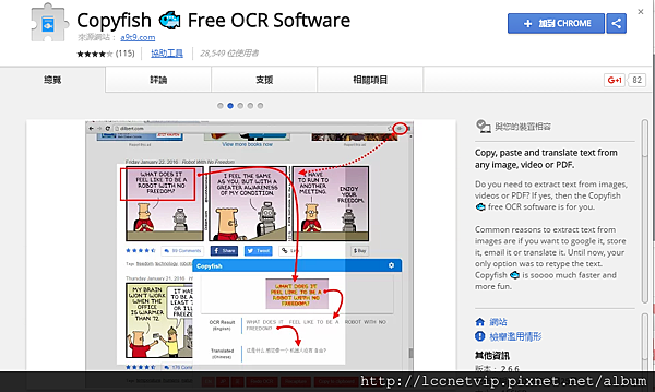 菜鳥救星教學專欄:將圖片中的文字抓取出來的五種方法(下) 發佈日期: 2021-04-052021-03-25 作者: yijun 文、菜鳥編 四、Chrome套件篇 如果是想要擷取影片中的文字,或是網頁上的圖片想要抓取出文字,那使用Chrome的套件就會非常方便,鳥編推薦給大家的是名為「Copfish free OCR」的套件,可將影片或圖片中的文字框選起來辨識出文字,準確度也是相當不賴。 進到應用程式商店將套件安裝起來。 安裝後,首先要做的就是先將語言設定完成,不然可能會判斷錯誤,點擊套件的選項就可進入設定頁面。 將語系都設定成中文。 先來測試看看影片中的文字抓取效果,例如要抓取下面「為的就是那神秘的大秘寶」。 點擊套件後,在影片文字中框選起來就會開始辨識,以下也很成功的抓取出來,不過有時候會因為影片背景與文字字型導致抓取不是太準確,不過還在可以接受的範圍內。 接著嘗試看看圖片或網頁的抓取效果,方是一樣,框選出要辨識的範圍,點擊時應用程式,會發現網頁整體會變暗,而選取的區域是明亮的呈現方式。 辨識的效果比影片更有好的表現,文字整個是有被抓取到,而且相當準確。 五、線上工具篇 如果你常觀看鳥編的文章,應該會發現,我本身也喜歡使用線上免費提供的工具來作業,以OCR來說,目前鳥編使用上還不錯的就是「Free Online OCR」,進到首頁,也可以看到支援的圖片格式相當多,JPEG、PNG、GIF、BMP、TIFF、PDF常見的檔案格式都有包含到。 操作方式也很簡單,可透過上傳或是提供URL方式來進行。 這邊將圖片上傳完後,點擊下方的「Preview」來查看,接著將你要辨識的範圍將選取出來。 不過還記的先將語言設定好喔,以免判斷錯誤,預設是English,將它修正為「Chinese-Traditional」,最後點擊OCR來進行辨識,就可以看到效果。 下方立刻會出現結果,也是相當不錯的表現。 總共提供了五種方式,可依照適合自己,或是可以透過Google找出其他的軟體來幫助你作業,如果有好的也可以推薦給鳥編喔。 加入菜鳥救星官方Line並回覆「我想看文章」,不定期獲得更多知識吧! 不同頻道,不同知識! Facebook Instagram Youtube 分享此文: 分享到 X(在新視窗中開啟) X 分享到 Facebook(在新視窗中開啟) Facebook 分享到 Telegram(在新視窗中開啟) Telegram 以電子郵件將連結傳送給朋友(在新視窗中開啟) 電子郵件 請按讚:喜歡 正在載入... 相關