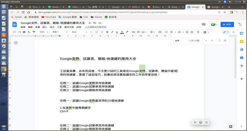 Google文件必學的10個快捷鍵!讓你在編輯時贏在起跑點 發佈日期: 2023-03-292023-03-14 作者: yijun 文、意如老師 工欲善其事,必先利其器,今天要介紹的工具是在Google文件中最常用的快捷鍵,掌握了這些技巧,就像如虎添翼般讓您的工作效率更加倍! 1. 在一大篇文章中找出關鍵字 快捷鍵:【Ctrl】+【F】 說明:按下快捷鍵【Ctrl】+【F】再輸入要尋找的字串即可。 2. 快速還原上一個動作 快捷鍵:【Ctrl】+【Z】 說明:不小心做錯了,按下快捷鍵【Ctrl】+【Z】即可快速還原上一個動作。 3. 貼上文字時不套用格式 快捷鍵:【Ctrl】+【Shift】+【V】 說明:每次複製【Ctrl】+【C】貼上【Ctrl】+【V】時,總會把原先的文字格式一起複製過來,只要使用快捷鍵【Ctrl】+【Shift】+【V】來貼上,則不套用原來的格式。 4. 清除文字格式、樣式 快捷鍵:【Ctrl】+【\】 說明:選取有套用一些格式的文字後,使用快捷鍵【Ctrl】+【\】,即可快速清除文字格式。 5. 放大與縮小字體 文字放大快捷鍵:【Ctrl】+【Shift】+【.】(快速鍵中的【.】不能是獨立數字鍵的)文字縮小快捷鍵:【Ctrl】+【Shift】+【,】 說明:選取文字後使用快捷鍵【Ctrl】+【Shift】+【.】即可加大文字設定,反之【Ctrl】+【Shift】+【,】即可縮小文字設定。 6. 增加與減少段落縮排 增加段落縮排快捷鍵:【Ctrl】+【]】減少段落縮排快捷鍵:【Ctrl】+【[】 說明:選取文字後可使用快捷鍵【Ctrl】+【[】來增加縮排(文字向右縮排),而【Ctrl】+【]】鍵即可減少縮排(文字向左縮排)。 7. 文字與段落置中對齊 置中對齊快捷鍵:【Ctrl】+【Shift】+【E】 說明:選取文字或是將滑鼠游標放置該行或該段落要置中的文字,再使用快速鍵【Ctrl】+【Shift】+【E】即可將整行文字或段落快速置中對齊。 8. 編號與項目符號清單 編號清單快捷鍵:【Ctrl】+【Shift】+【7】 1. 項目一2. 項目二3. 項目三 項目符號清單快捷鍵:【Ctrl】+【Shift】+【8】 • 項目一• 項目二• 項目三 說明:將所有項目分行後,選取所有項目搭配【Ctrl】+【Shift】+【7】快捷鍵,即可生成編號清單,如要使用項目清單則搭配【Ctrl】+【Shift】+【8】快捷鍵。 9. 快速分頁 快速分頁快捷鍵:【Ctrl】+【Enter】 說明:將滑鼠游標放置要分頁處,使用快捷鍵【Ctrl】+【Enter】,即可快速分頁至下一頁 10. 放大縮小檢視文件 放大檢視文件快捷鍵:【Ctrl】+滑鼠滾輪向上縮小檢視文件快捷鍵:【Ctrl】+滑鼠滾輪向下 說明:將滑鼠游標放置檢視的文字中,搭配【Ctrl】+滑鼠滾輪向上或向下鍵,即可快速調整檢視的比例大小。 加入菜鳥救星官方Line並回覆「我想看文章」,不定期獲得更多知識吧! 不同頻道,不同知識! Facebook Instagram Youtube 分享此文: 分享到 X(在新視窗中開啟) X 分享到 Facebook(在新視窗中開啟) Facebook 分享到 Telegram(在新視窗中開啟) Telegram 以電子郵件將連結傳送給朋友(在新視窗中開啟) 電子郵件 請按讚:喜歡 正在載入... 相關