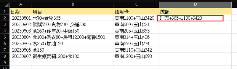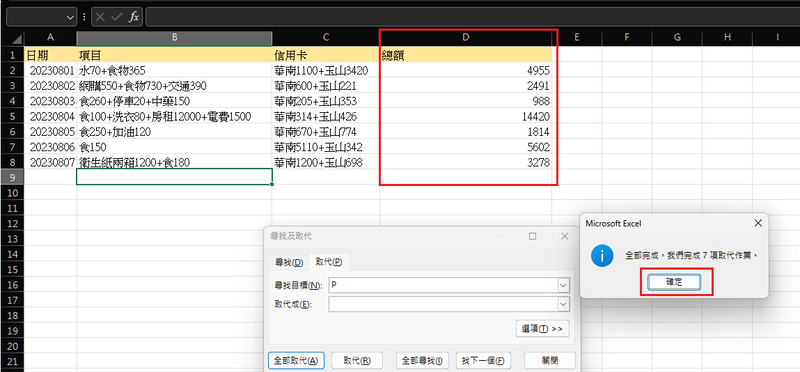 Excel Ctrl+E 快速鍵五大神技:數據計算、文字轉換、格式變更、內容合併、資料隱碼 發佈日期: 2024-06-122024-12-10 作者: yijun 文、意如老師 在現代工作生活中,Excel已成為不可或缺的工具之一,而要成為Excel的真正高手,你需要掌握其中的種種技巧和快捷方式。 在這篇文章中,將帶你探索Ctrl+E這個強大的快速鍵5大神奇應用。 無論你是新手還是經驗豐富的Excel用戶,這些技巧都能助你更快、更輕鬆地處理數據,提高工作效率,現在,就讓我們來看看Ctrl+E快速鍵有哪些令人驚艷的應用。 讀完這篇文章你可以學到:一、數據專業計算-Ctrl+E 快速鍵的秘密二、文字變換大師-Ctrl+E 替換神技大公開三、資料風格魔法-利用 Ctrl+E 改變資料格式四、內容大融合-Ctrl+E 快速合併應用五、資料密碼解讀-Ctrl+E 資料隱碼術 一、數據專業計算-Ctrl+E快速鍵的秘密 首先,準備好一個包含單位與數據的表格,如下所示: 接下來,我們將計算總額,這需要將每個項目欄位的值與信用卡欄位的值相加。 舉例來說,對於日期2023年08月01日,花費項目包括水(70元)和食物(365元),再加上信用卡的花費金額(華南信用卡1100元、玉山信用卡3420元)。要計算這一天的總額,我們可以使用以下公式: D2的公式 = 70 + 365 + 1100 + 3420 在輸入公式之前,建議在公式前面添加一個任意字母,例如 “P=”,使公式更易讀,如下圖所示: 輸入完公式後,點選D2儲存格後,使用魔法快速鍵,CTRL+E 快速填滿公式。 如下圖所示,你已順利填滿了以下儲存格,節省了大量的時間和工作: 接下來,使用尋找/取代功能,將多餘的字元 “P” 去掉,這樣就可以自動計算出總額。 你可以進入Excel的「常用」選單,然後選擇「尋找/取代」,或者直接使用快速鍵 Ctrl+H 來啟動尋找/取代功能。 接著,進行以下步驟:選擇「取代」選項。在「尋找目標」中輸入字元 “P”。在「取代成」中留空白,即不輸入任何內容。點選「全部取代」。這樣,所有的 “P” 字元都將被替換為空白,這使得公式可以正確運作並計算出總額。 這個步驟非常重要,因為它確保了你的公式能夠順利執行,而不會因為多餘的字符而出現錯誤。 完成這些步驟後,你將會看到總額已經自動計算完畢 二、文字變換大師-Ctrl+E 替換神技大公開 範例如下,原始數據為 $ + 金額 + 元,例如$100元,接下來我們要把”$”字號改成NT ,然後”元”改成 .00 直接在B2儲存格中輸入想要呈現的結果,例如 NT100.00 接下來按下Ctrl+E 填滿即可全部取代所有的資料 三、資料風格魔法-利用 Ctrl+E 改變資料格式 原始資料:生日為1978/5/31電話為03-9876543 更改格式:生日為[1978-5-31]電話為(03)9876543將要更改的格式分別鍵入在D2儲存格與E2儲存格,如下圖 接著分別選擇D2儲存格按下Ctrl+E,以及選擇E2儲存格後按下Ctrl+E,快速填滿,完成檔如下: 四、內容大融合-Ctrl+E 快速合併應用 準備原始資料,如下圖 接著將需要合併的結果填入D2儲存格,例如:姓名+生日的月/日+電話,在D2輸入想要的格式:黃俊宏5/31-(03)9876543,如下圖 輸入完格式後,點擊D2儲存格後按下Ctrl+E快速填滿,完成檔如下: 五、資料密碼解讀-Ctrl+E 資料隱碼術 原始資料如下圖 接著將預設隱碼內容改為*,分別輸入在C2與D2儲存格例如:姓名隱碼為黃** 身分證隱碼為G111***643,參考如下圖 最後點擊C2後按下Ctrl+E與點擊D2後按下Ctrl+E ,即可快速將其他資料一次填滿所需格式,完成檔如下 在Excel 中的Ctrl+E快速鍵就像一把魔杖,能讓你輕鬆處理各種數據任務,並在工作中節省大量時間。我們剛剛分享的五大技巧,包括計算、替換、格式設定、合併和資料解讀,無論你是處理財務報表、管理項目數據還是進行市場分析,都將成為你的得力助手。 加入菜鳥救星官方Line並回覆「我想看文章」,不定期獲得更多知識吧! 不同頻道,不同知識! Facebook Instagram Youtube 分享此文: 分享到 X(在新視窗中開啟) X 分享到 Facebook(在新視窗中開啟) Facebook 分享到 Telegram(在新視窗中開啟) Telegram 以電子郵件將連結傳送給朋友(在新視窗中開啟) 電子郵件 請按讚:喜歡 正在載入... 相關