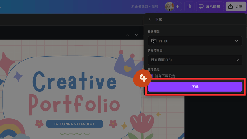 - 完成設計後,點擊”分享”按鈕,選擇”下載”。