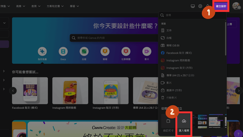 在Canva的首頁上,點擊「創建設計」按鈕,選擇「匯入檔案」。選擇你的PPT文件並上傳。