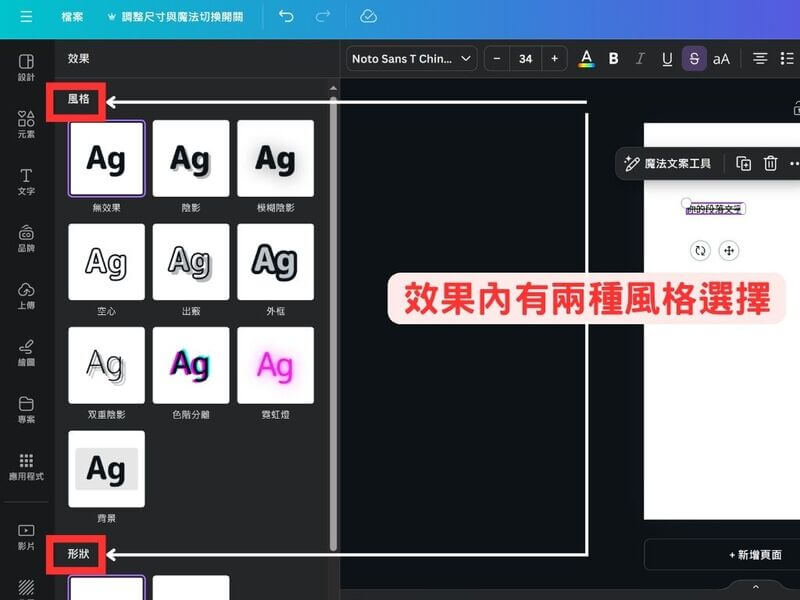 Canva 提供了多種文字效果,讓使用者能夠輕鬆地為文字添加視覺效果。