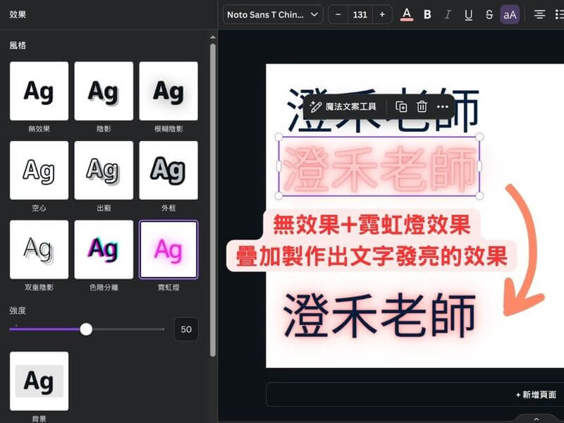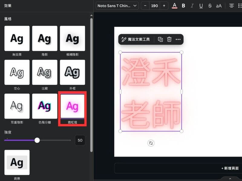 在 Canva 中,你可以在效果中找到霓虹燈效果,會依照你選擇的文字顏色創造出霓虹燈的效果,且能自由調整光暈的強度。