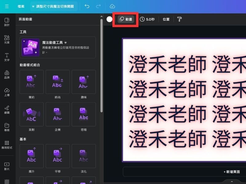 Canva 也提供了動態文字效果,讓你的設計更加生動。在製作影片或動態貼文時,你可以為文字添加動畫效果,例如淡入淡出、滑動和旋轉等。