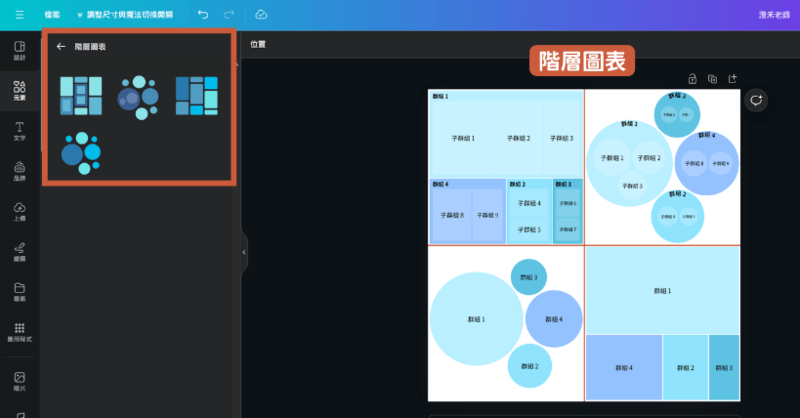 步驟1.打開新專案或現有設計,在功能列的”元素”中找到”圖表”