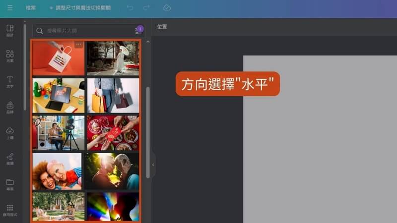 - 方向篩選: 選擇方形、垂直或水平的圖片尺寸。