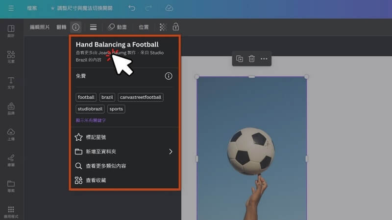 名稱下會顯示此張照片的”創作者”。可點選查看這位創作者的其他作品,也可點擊”關鍵字標籤”快速搜尋。